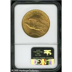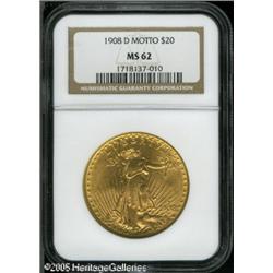 <B>1908-D $20 Motto MS62 NGC.</B></I> Lightly marked for the grade despite a couple of wispy abrasions on the sun, this piece provides booming luster and has a reasonable strike.<BR><I>From The Mike Jacobson Collection.</B></I> Lot:9480