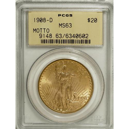 <B>1908-D $20 Motto MS63 PCGS.</B></I> This is a splendidly lustrous Select Mint State example. The bright surfaces display yellow-gold toning, with faint accents of pink in the centers. Most of the trivial, grade-defining marks are located on the obverse.<BR><BR><b>Shipping:</b> Coins & Currency (<a target="_blank" href="http://www.heritageauctions.com/common/shipping.php">view shipping information</a>)