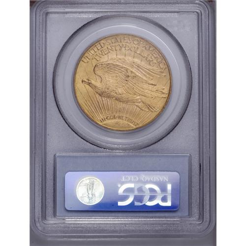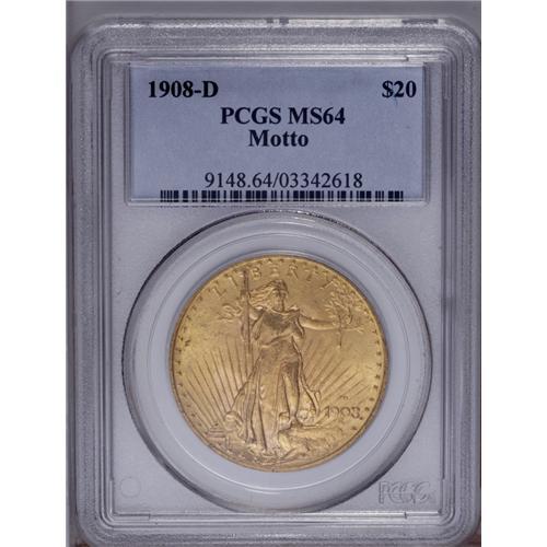 <B>1908-D $20 Motto MS64 PCGS.</B></I> Medium gold in color with a tinge of green-gold patination, the surfaces are silent on the subject of singularly distracting bagmarks. Nicely struck, as befits the issue.