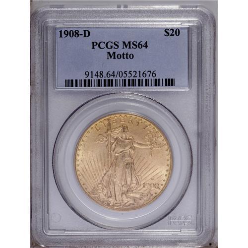 1908-D $20 Motto MS64 PCGS. Sharply struck with charac 1908-D[$20] Motto MS64 PCGS.