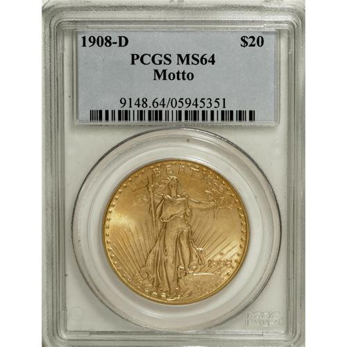 <B>1908-D $20 Motto MS64 PCGS.</B></I> Slightly over one-third of the 1908-D double eagles coined are of the With Motto variety. The slightly subdued luster of the yellow-gold obverse is considerably more potent on the reverse, and the surfaces have great quality overall. A single abrasion at Liberty's waist defines the grade.<BR><BR><b>Shipping:</b> Coins & Currency (<a target="_blank" href="http://www.heritageauctions.com/common/shipping.php">view shipping information</a>)