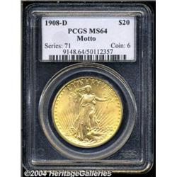 <B>1908-D<$20> Motto MS64 PCGS.</B></I> The 1908-D is still a better date among early Saints, but it is not quite the rarity it once was, before the discovery of a hoard some years ago. Boldly struck, the surfaces are light in color with a fine grain texture and satiny luster. Minimally marked, for a near-Gem, with a broken grease streak (as struck) on the upper left obverse. <BR><BR><B>Important notice:</B> Heritage usually auctions material at the rate of 200-250 lots per hour. On some occasions eBay Live bid software or the Internet may not be able to keep up with the pace of the auction. We recommend placing a realistic absentee bid now as insurance to avoid disappointment. Occasionally the auctioneer may eliminate or reject an eBay Live bid, and the auctioneer may also reopen a lot after the close of the eBay live bidding (usually because we missed an audience bid), and may reject your bid even if it shows you as the winning bidder. By bidding via eBay Live, you agree that Heritage may award the lot to another bidder at its sole discretion under the circumstances described above or any other reasonable circumstances. Since eBay bids are not shown to us until we open the lot on the floor, we treat those bids just like floor bids. In most cases the floor responds before the eBay bid is presented to us, due to Internet lag time, so for consistency we have made it a policy that floor bids are always considered first over tie eBay live bids. Also please note that all Heritage lots purchased through eBay Live carry a 20% Buyer's Premium. Please make sure you read the Terms and Conditions before you bid. </span></font></tr></table></td></tr></table>
