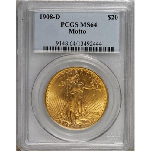 <B>1908-D $20 Motto MS64 PCGS.</B></I> This canary-gold Choice Saint-Gaudens twenty features good luster and pleasing preservation. The strike is precise on Liberty’s face, as well as on the Capitol building.<BR><BR><B>Coin Engraver:</B> Augustus Saint-Gaudens<BR><BR><b>Shipping:</b> Coins & Currency (<a target="_blank" href="http://www.heritageauctions.com/common/shipping.php">view shipping information</a>)