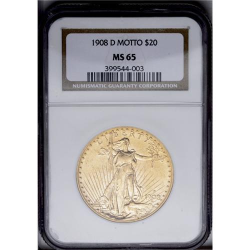 <B>1908-D<$20> Motto MS65 NGC.</B></I> Twenty years ago a large hoard of high grade 1908-D double eagles were discovered. Prior to that, this issue was considered one of the better dates in the series at the Mint State level. Today the '08-D is a better date type coin, and it is one of the few early issues that can be located with a strong strike and clean surfaces. This copper tinted example has superior luster characteristics and surfaces that show an exceptionally clean finish. One small mark is noted in the right obverse field near the rim. Census: 66 in 65, 6 finer (3/06). <BR><BR><B>Important notice:</B> Heritage usually auctions material at the rate of 200-250 lots per hour. On some occasions eBay Live bid software or the Internet may not be able to keep up with the pace of the auction. We recommend placing a realistic absentee bid now as insurance to avoid disappointment. Occasionally the auctioneer may eliminate or reject an eBay Live bid, and the auctioneer may also reopen a lot after the close of the eBay live bidding (usually because we missed an audience bid), and may reject your bid even if it shows you as the winning bidder. By bidding via eBay Live, you agree that Heritage may award the lot to another bidder at its sole discretion under the circumstances described above or any other reasonable circumstances. Since eBay bids are not shown to us until we open the lot on the floor, we treat those bids just like floor bids. In most cases the floor responds before the eBay bid is presented to us, due to Internet lag time, so for consistency we have made it a policy that floor bids are always considered first over tie eBay live bids. Also please note that all Heritage lots purchased through eBay Live carry a 20% Buyer's Premium. Please make sure you read the Terms and Conditions before you bid. This lot is being auctioned in conjunction with a live floor auction by Heritage Galleries & Auctioneers. All final auction and invoice information will be supplied by Heritage Galleries & Auctioneers, and all other information should be considered preliminary. Lot:4569 <BR><BR><B>Winning Notification and Billing:</B> After the FINAL session in this auction is complete, Heritage will send e-mail and snail mail invoices. This process normally takes several days. All final auction and invoice information will be supplied by Heritage Galleries & Auctioneers, and all other information should be considered preliminary. <BR><BR>This auction will be conducted on a live auction floor and over the Internet through eBay Live. If you choose to place an absentee bid, please take a moment to <font color='#0000ff'><u><a href='http://pages.ebay.com/liveauctions/help/before/laabsentee.html'>learn how eBay Live absentee bidding works</a></u></font><font color='#000000'>
