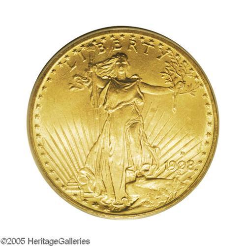 <B>1908-D<$20> Motto MS65 PCGS.</B></I> A popular better-date issue, though not the rarity it was before the discovery of a hoard about twenty years ago. Conditionally scarce, this example has honey-golden tinted surfaces and a sharp strike that characterize the issue and is relatively free of the notable imperfections that mar many of its lower grade counterparts. Somewhat frosty luster and nice eye appeal. Housed in an earlier PCGS holder with a green label.