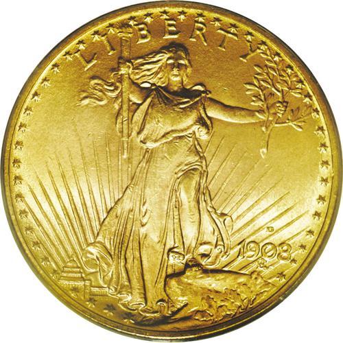 <B>1908-D<$20> Motto MS65 PCGS.</B></I> A strikingly lustrous and well preserved Gem example of this scarce issue. Boldly struck with fine-grain, matte-like surfaces that only show a handful of marks and pleasing straw-gold color. As scarce as it is at the Gem level, the 1908-D Motto is exceedingly difficult any finer.