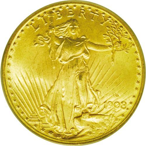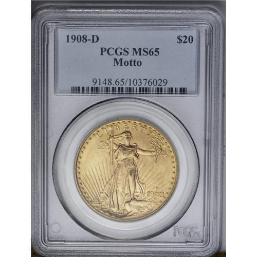 <B>1908-D<$20> Motto MS65 PCGS.</B></I> An exceptionally clean example of this conditionally scarce and somewhat underrated issue. The mint frost shows light pinkish-rose color with splash of antique-golden. Some dark color is noted on the highpoints of Liberty, and a small abrasion is noted on the upper portion of the torch. A must-see Saint for the gold specialist.