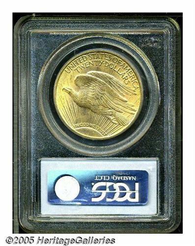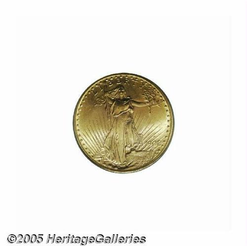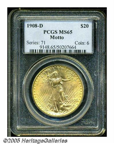 <B>1908-D<$20> Motto MS65 PCGS.</B></I> Bright and lustrous, with good eye appeal and only a touch of light haze to mark the passage of time. About as nice as this date is ever found, and fairly difficult to obtain in Gem condition as seen here. Population: 141 in 65, 15 finer (6/05).