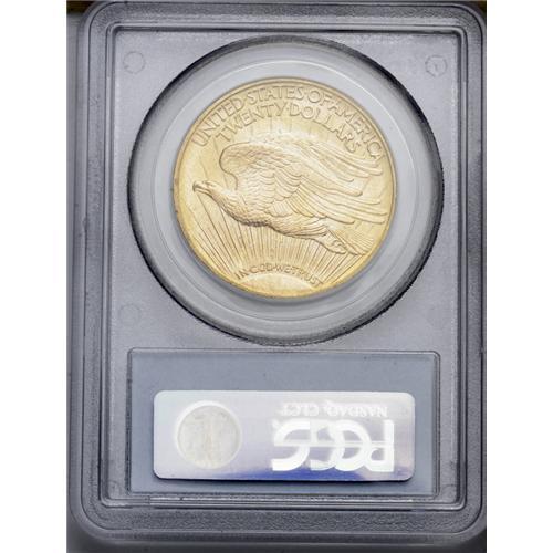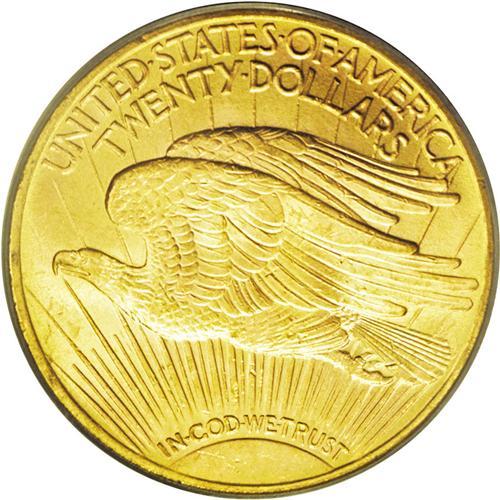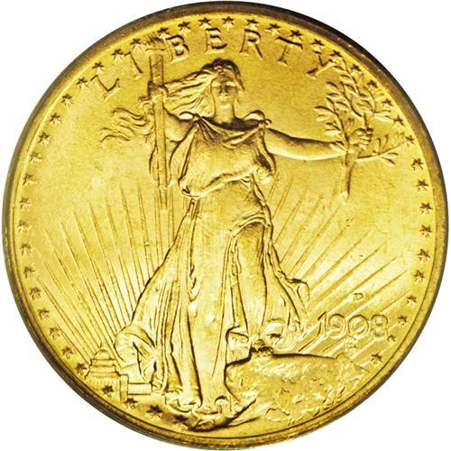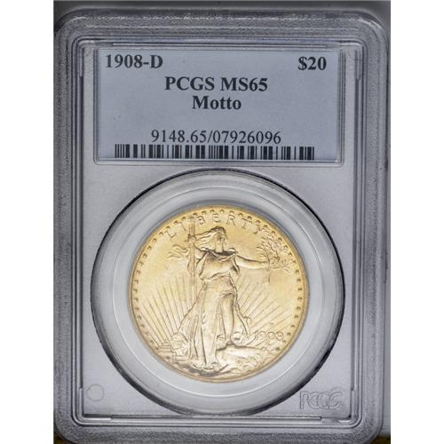 <B>1908-D<$20> Motto MS65 PCGS.</B></I> Fully lustrous and exceptionally attractive. It is virtually fully struck with wonderful surfaces that exhibit only an occasional mark. This is a scarce date from a mintage of just 349,500 coins, and a low survival rate in Gem quality. Only 20 finer examples have been certified by PCGS (5/06).