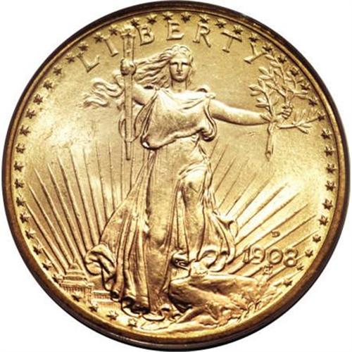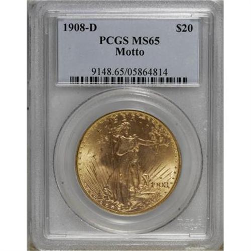 <B>1908-D $20 Motto MS65 PCGS.</B></I> With only 25 examples graded higher at PCGS (3/08), the current 1908-D With Motto double eagle will attract much attention when it crosses the auction block. This conservatively graded Gem piece seems to call to a higher grade, with rich luster and fields that are pleasantly free of distractions. <BR><BR><B>Coin Engraver:</B> Augustus Saint-Gaudens<BR><BR><b>Shipping:</b> Coins & Currency (<a target="_blank" href="http://www.heritageauctions.com/common/shipping.php">view shipping information</a>)