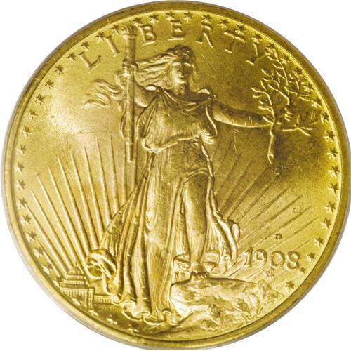 <B>1908-D $20 Motto MS66 PCGS.</B></I> Mint State 1908-D With Motto double eagles are readily available in grades through MS64, partly because of a hoard of several hundred pieces that surfaced in 1983 in Central America. The issue becomes scarce at the Gem level, and is a downright rarity in Premium Gem and better condition. Indeed, PCGS and NGC combined have certified slightly over 20 MS66 examples and a mere five pieces in MS67, with neither service seeing any coins finer.<BR> When the motto IN GOD WE TRUST was added to the lower reverse, the design detail on the master hub was also enhanced. Consequently, the design elements of the 1908-D With Motto are much more sharply defined than those on the typical 1908-D No Motto. The Premium Gem With Motto example in the current lot illustrates these bolder striking impressions in the panes of the Capitol building, on Liberty's facial features, fingers, and toes, and on the eagle's torso feathers. Both sides are awash in vibrant luster that emanates from apricot and peach-gold surfaces accented with subtle lime-green hues. Close inspection reveals just a few trivial marks, none of which are worthy of individual mention. Population: 17 in 66, 3 finer (10/06).<BR><I>From The Kutasi Collection.</B></I><BR><BR><b>Shipping:</b> Coin/Currency (<a target="_blank" href="http://www.heritageauctions.com/common/shipping.php">view shipping information</a>)