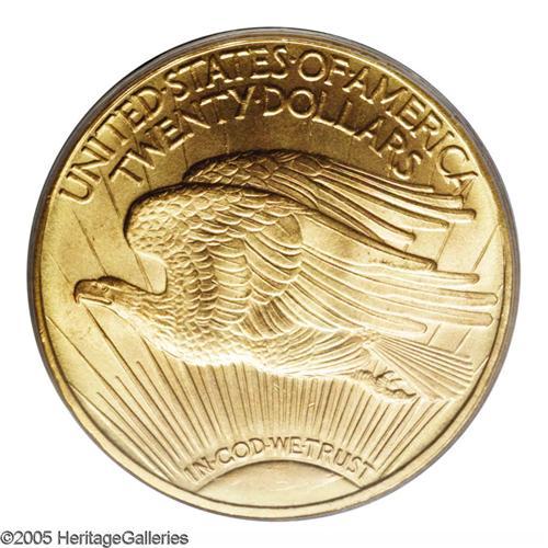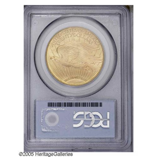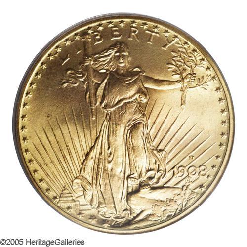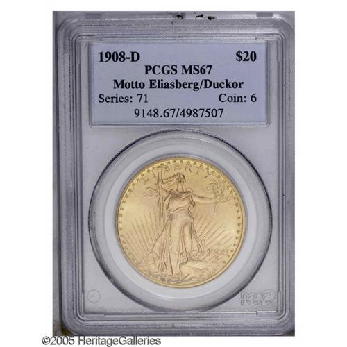 <B>1908-D<$20> Motto MS67 PCGS.</B></I> Ex: Eliasberg/Duckor. This is one of a handful of the finest known 1908-D Motto double eagles in existence. The satiny surfaces gleam with a lovely lemon-yellow color, accentuated on the obverse by copper-red highlights around the glory of rays, Liberty's flowing hair, and the central highpoints. The reverse is also a lustrous lemon-yellow, with more muted hints of copper-red centering around the eagle's rear feathers. The strike is boldly brought up, even in areas that are often found weak, such as Liberty's face and torch, her left foot details, and the feathers on the eagle's lower breast. The Capitol, the rock, and the leaves nearby are all incredibly bold. Accuracy requires mention of a couple of minute marks on Liberty's breast, unnoticed without a glass. A prime opportunity to acquire this phenomenally attractive, desirable, and illustriously pedigreed coin. Population: 3 in MS67, 0 finer (10/05).<BR><I>Ex: Eliasberg Collection (Bowers and Ruddy, 10/82), lot 1028, where it brought $10,450; Dr. Steven Duckor.</B></I><BR><I>From The Phillip H. Morse Collection of Saint-Gaudens Coinage, Part Three.</B></I>