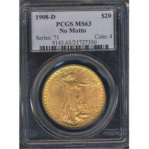 1908-D $20 NO MOT ST. GAUDEN PCGS MS63