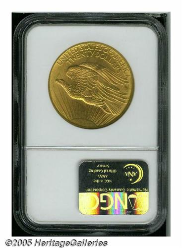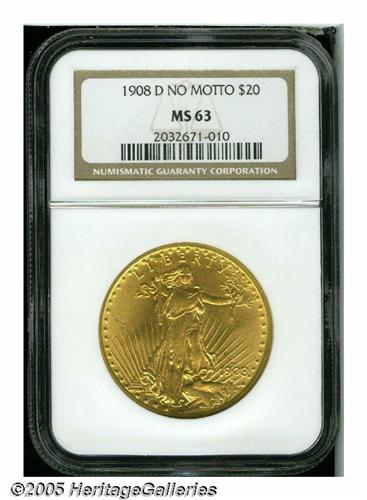 <B>1908-D<$20> No Motto MS63 NGC.</B></I> Exquisite strike detail stands out on this coppery-gold, lustrous Double Eagle. The surfaces are somewhat of a grainy nature, revealing only a few small, trivial abrasions in accordance with the assigned grade.