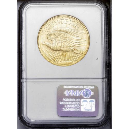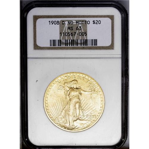 <B>1908-D<$20> No Motto MS63 NGC.</B></I> Lustrous apricot-gold surfaces display sharply struck design elements, including excellent definition on Liberty's face, fingers, and toes, and on the Capitol building. A few minute marks are noted on Liberty's portrait and in the right obverse field. <BR><BR><B>Important notice:</B> Heritage usually auctions material at the rate of 200-250 lots per hour. On some occasions eBay Live bid software or the Internet may not be able to keep up with the pace of the auction. We recommend placing a realistic absentee bid now as insurance to avoid disappointment. Occasionally the auctioneer may eliminate or reject an eBay Live bid, and the auctioneer may also reopen a lot after the close of the eBay live bidding (usually because we missed an audience bid), and may reject your bid even if it shows you as the winning bidder. By bidding via eBay Live, you agree that Heritage may award the lot to another bidder at its sole discretion under the circumstances described above or any other reasonable circumstances. Since eBay bids are not shown to us until we open the lot on the floor, we treat those bids just like floor bids. In most cases the floor responds before the eBay bid is presented to us, due to Internet lag time, so for consistency we have made it a policy that floor bids are always considered first over tie eBay live bids. Also please note that all Heritage lots purchased through eBay Live carry a 20% Buyer's Premium. Please make sure you read the Terms and Conditions before you bid. This lot is being auctioned in conjunction with a live floor auction by Heritage Galleries & Auctioneers. All final auction and invoice information will be supplied by Heritage Galleries & Auctioneers, and all other information should be considered preliminary. Lot:4555 <BR><BR><B>Winning Notification and Billing:</B> After the FINAL session in this auction is complete, Heritage will send e-mail and snail mail invoices. This process normally takes several days. All final auction and invoice information will be supplied by Heritage Galleries & Auctioneers, and all other information should be considered preliminary. <BR><BR>This auction will be conducted on a live auction floor and over the Internet through eBay Live. If you choose to place an absentee bid, please take a moment to <font color='#0000ff'><u><a href='http://pages.ebay.com/liveauctions/help/before/laabsentee.html'>learn how eBay Live absentee bidding works</a></u></font><font color='#000000'>