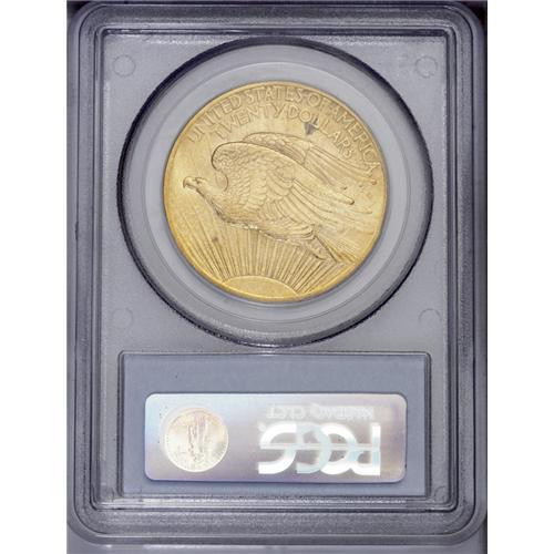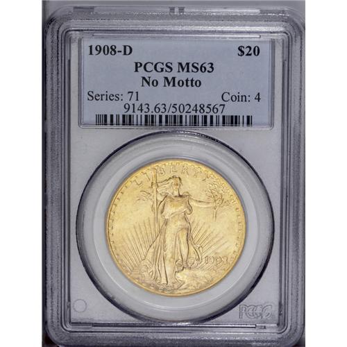 <B>1908-D<$20> No Motto MS63 PCGS.</B></I> Exceedingly bright luster flashes over straw-gold surfaces that have a faint greenish cast on each side. Small abrasions appear on both sides, and a couple of alloy spots are noted on the reverse. The 1908-D No Motto is much scarcer than its P-mint counterpart.