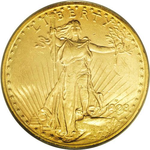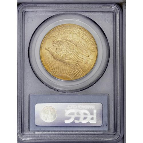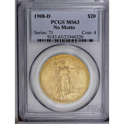 <B>1908-D<$20> No Motto MS63 PCGS.</B></I> Frosty mint luster with a touch of haze over the surfaces. <BR><BR><B>Important notice:</B> Heritage usually auctions material at the rate of 200-250 lots per hour. On some occasions eBay Live bid software or the Internet may not be able to keep up with the pace of the auction. We recommend placing a realistic absentee bid now as insurance to avoid disappointment. Occasionally the auctioneer may eliminate or reject an eBay Live bid, and the auctioneer may also reopen a lot after the close of the eBay live bidding (usually because we missed an audience bid), and may reject your bid even if it shows you as the winning bidder. By bidding via eBay Live, you agree that Heritage may award the lot to another bidder at its sole discretion under the circumstances described above or any other reasonable circumstances. Since eBay bids are not shown to us until we open the lot on the floor, we treat those bids just like floor bids. In most cases the floor responds before the eBay bid is presented to us, due to Internet lag time, so for consistency we have made it a policy that floor bids are always considered first over tie eBay live bids. Also please note that all Heritage lots purchased through eBay Live carry a 20% Buyer's Premium. Please make sure you read the Terms and Conditions before you bid. This lot is being auctioned in conjunction with a live floor auction by Heritage Galleries & Auctioneers. All final auction and invoice information will be supplied by Heritage Galleries & Auctioneers, and all other information should be considered preliminary. Lot:4556 <BR><BR><B>Winning Notification and Billing:</B> After the FINAL session in this auction is complete, Heritage will send e-mail and snail mail invoices. This process normally takes several days. All final auction and invoice information will be supplied by Heritage Galleries & Auctioneers, and all other information should be considered preliminary. <BR><BR>This auction will be conducted on a live auction floor and over the Internet through eBay Live. If you choose to place an absentee bid, please take a moment to <font color='#0000ff'><u><a href='http://pages.ebay.com/liveauctions/help/before/laabsentee.html'>learn how eBay Live absentee bidding works</a></u></font><font color='#000000'>