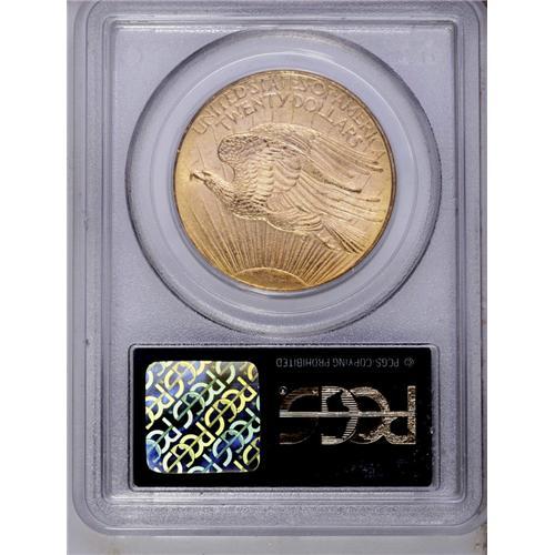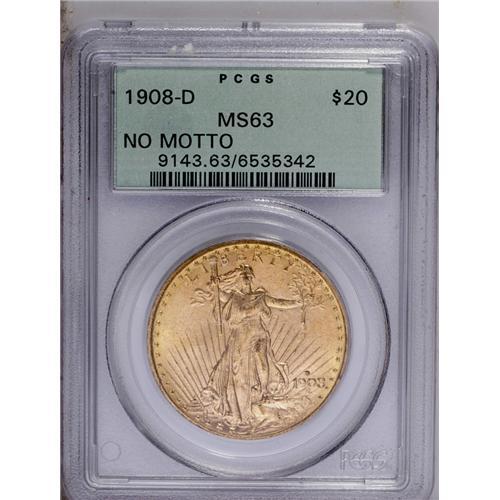 <B>1908-D<$20> No Motto MS63 PCGS.</B></I> Long Rays Obverse. A lovely gold type coin with lime-tinged borders and pumpkin-gold interiors. Lustrous and attractively preserved. Encased in a green label holder.