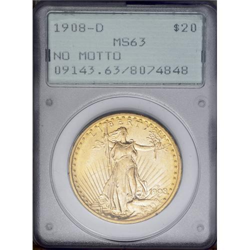 <B>1908-D<$20> No Motto MS63 PCGS.</B></I> Rich lemon toning invigorates this lustrous and reasonably struck example. Each side has a brief hard-to-find pinscratch, but the surfaces are clean overall. Encapsulated in a first generation holder.
