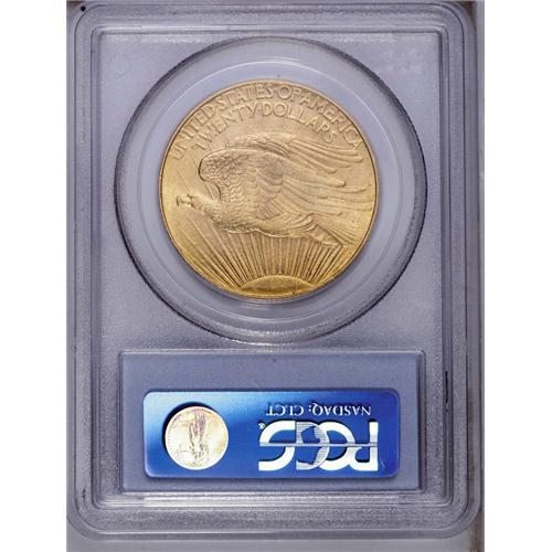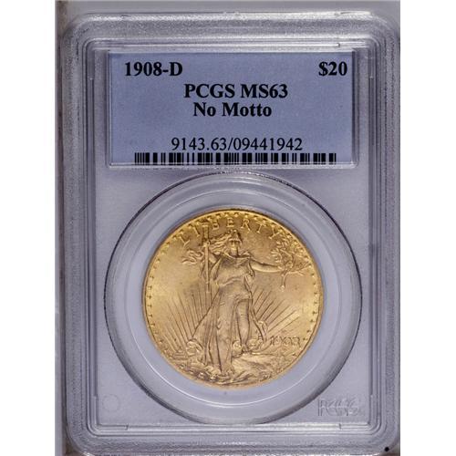 <B>1908-D<$20> No Motto MS63 PCGS.</B></I> Very well defined for this initial D-mint delivery of the type. Both sides exhibit bright, matte-like surfaces and moderate abrasions. <BR><BR><B>Important notice:</B> Heritage usually auctions material at the rate of 200-250 lots per hour. On some occasions eBay Live bid software or the Internet may not be able to keep up with the pace of the auction. We recommend placing a realistic absentee bid now as insurance to avoid disappointment. Occasionally the auctioneer may eliminate or reject an eBay Live bid, and the auctioneer may also reopen a lot after the close of the eBay live bidding (usually because we missed an audience bid), and may reject your bid even if it shows you as the winning bidder. By bidding via eBay Live, you agree that Heritage may award the lot to another bidder at its sole discretion under the circumstances described above or any other reasonable circumstances. Since eBay bids are not shown to us until we open the lot on the floor, we treat those bids just like floor bids. In most cases the floor responds before the eBay bid is presented to us, due to Internet lag time, so for consistency we have made it a policy that floor bids are always considered first over tie eBay live bids. Also please note that all Heritage lots purchased through eBay Live carry a 20% Buyer's Premium. Please make sure you read the Terms and Conditions before you bid. This lot is being auctioned in conjunction with a live floor auction by Heritage Galleries & Auctioneers. All final auction and invoice information will be supplied by Heritage Galleries & Auctioneers, and all other information should be considered preliminary. Lot:4554 <BR><BR><B>Winning Notification and Billing:</B> After the FINAL session in this auction is complete, Heritage will send e-mail and snail mail invoices. This process normally takes several days. All final auction and invoice information will be supplied by Heritage Galleries & Auctioneers, and all other information should be considered preliminary. <BR><BR>This auction will be conducted on a live auction floor and over the Internet through eBay Live. If you choose to place an absentee bid, please take a moment to <font color='#0000ff'><u><a href='http://pages.ebay.com/liveauctions/help/before/laabsentee.html'>learn how eBay Live absentee bidding works</a></u></font><font color='#000000'>