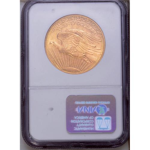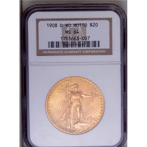<B>1908-D<$20> No Motto MS64 NGC.</B></I> Long Rays Obverse. This pumpkin-gold near-Gem displays vibrant luster, and the strike is superior for the No Motto type. Struck from moderately rotated dies.