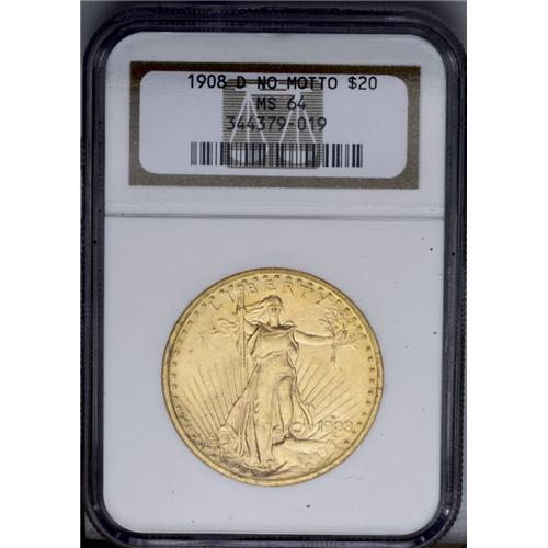 <B>1908-D<$20> No Motto MS64 NGC.</B></I> Long Rays hub. A crisply struck honey-gold piece with a couple of unimportant marks beneath the TY in LIBERTY. Struck from moderately rotated dies. <BR><BR><B>Important notice:</B> Heritage usually auctions material at the rate of 200-250 lots per hour. On some occasions eBay Live bid software or the Internet may not be able to keep up with the pace of the auction. We recommend placing a realistic absentee bid now as insurance to avoid disappointment. Occasionally the auctioneer may eliminate or reject an eBay Live bid, and the auctioneer may also reopen a lot after the close of the eBay live bidding (usually because we missed an audience bid), and may reject your bid even if it shows you as the winning bidder. By bidding via eBay Live, you agree that Heritage may award the lot to another bidder at its sole discretion under the circumstances described above or any other reasonable circumstances. Since eBay bids are not shown to us until we open the lot on the floor, we treat those bids just like floor bids. In most cases the floor responds before the eBay bid is presented to us, due to Internet lag time, so for consistency we have made it a policy that floor bids are always considered first over tie eBay live bids. Also please note that all Heritage lots purchased through eBay Live carry a 20% Buyer's Premium. Please make sure you read the Terms and Conditions before you bid. This lot is being auctioned in conjunction with a live floor auction by Heritage Galleries & Auctioneers. All final auction and invoice information will be supplied by Heritage Galleries & Auctioneers, and all other information should be considered preliminary. Lot:4560 <BR><BR><B>Winning Notification and Billing:</B> After the FINAL session in this auction is complete, Heritage will send e-mail and snail mail invoices. This process normally takes several days. All final auction and invoice information will be supplied by Heritage Galleries & Auctioneers, and all other information should be considered preliminary. <BR><BR>This auction will be conducted on a live auction floor and over the Internet through eBay Live. If you choose to place an absentee bid, please take a moment to <font color='#0000ff'><u><a href='http://pages.ebay.com/liveauctions/help/before/laabsentee.html'>learn how eBay Live absentee bidding works</a></u></font><font color='#000000'>
