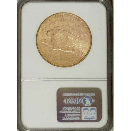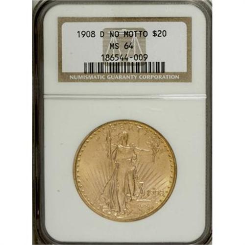 <B>1908-D $20 No Motto MS64 NGC.</B></I> The matte-like surfaces exhibit shimmering luster and a slight reddish tint on both sides. Uniformly bold definition is noted on every design element. A handful of trivial surface blemishes limit the grade. This issue becomes very scarce any finer. <BR><BR><b>Shipping:</b> Coins & Currency (<a target="_blank" href="http://www.heritageauctions.com/common/shipping.php">view shipping information</a>)
