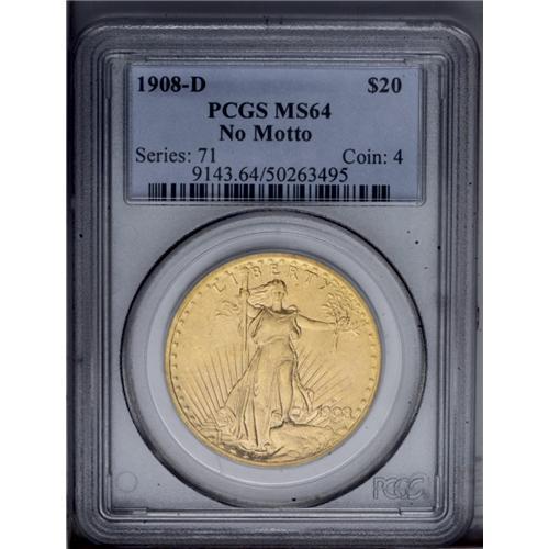 <B>1908-D<$20> No Motto MS64 PCGS.</B></I> An attractive piece with satin peach-gold surfaces. Luster is good, and overall surface chatter is appropriate for the grade. <BR><BR><B>Important notice:</B> Heritage usually auctions material at the rate of 200-250 lots per hour. On some occasions eBay Live bid software or the Internet may not be able to keep up with the pace of the auction. We recommend placing a realistic absentee bid now as insurance to avoid disappointment. Occasionally the auctioneer may eliminate or reject an eBay Live bid, and the auctioneer may also reopen a lot after the close of the eBay live bidding (usually because we missed an audience bid), and may reject your bid even if it shows you as the winning bidder. By bidding via eBay Live, you agree that Heritage may award the lot to another bidder at its sole discretion under the circumstances described above or any other reasonable circumstances. Since eBay bids are not shown to us until we open the lot on the floor, we treat those bids just like floor bids. In most cases the floor responds before the eBay bid is presented to us, due to Internet lag time, so for consistency we have made it a policy that floor bids are always considered first over tie eBay live bids. Also please note that all Heritage lots purchased through eBay Live carry a 20% Buyer's Premium. Please make sure you read the Terms and Conditions before you bid. This lot is being auctioned in conjunction with a live floor auction by Heritage Galleries & Auctioneers. All final auction and invoice information will be supplied by Heritage Galleries & Auctioneers, and all other information should be considered preliminary. Lot:4561 <BR><BR><B>Winning Notification and Billing:</B> After the FINAL session in this auction is complete, Heritage will send e-mail and snail mail invoices. This process normally takes several days. All final auction and invoice information will be supplied by Heritage Galleries & Auctioneers, and all other information should be considered preliminary. <BR><BR>This auction will be conducted on a live auction floor and over the Internet through eBay Live. If you choose to place an absentee bid, please take a moment to <font color='#0000ff'><u><a href='http://pages.ebay.com/liveauctions/help/before/laabsentee.html'>learn how eBay Live absentee bidding works</a></u></font><font color='#000000'>