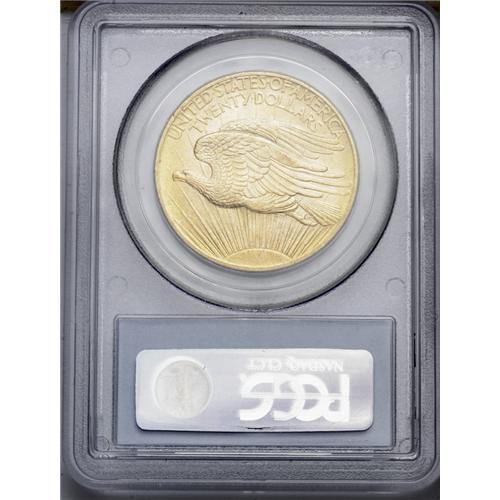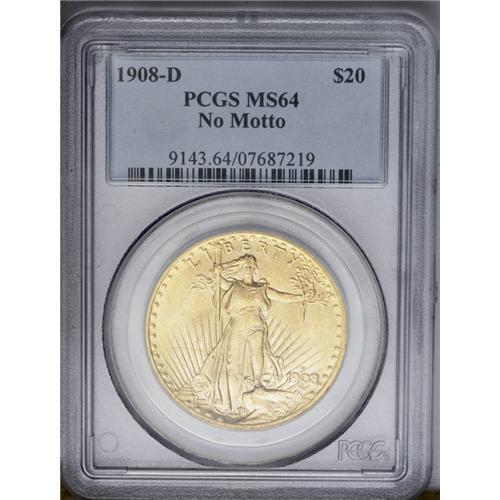 <B>1908-D<$20> No Motto MS64 PCGS.</B></I> At first glance seemingly high-end for the grade, with bounteous luster bursting forth from the lovely orange-gold, satiny surfaces. The strike is fairly well executed as well, if not absolute. A few light abrasions appear under a loupe, accounting for the near-Gem grade. A nice one!