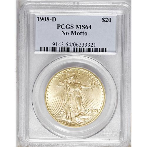 <B>1908-D<$20> No Motto MS64 PCGS.</B></I> Choice with great luster on the apricot-gold surfaces. This sharply struck piece has a few scattered abrasions that account for the grade.