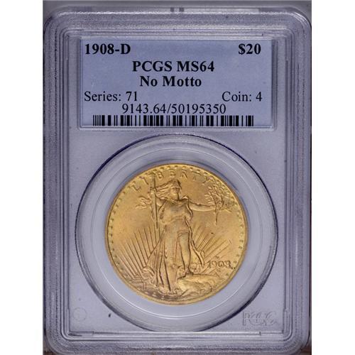 <B>1908-D<$20> No Motto MS64 PCGS.</B></I> The matte-like surfaces are lustrous and attractively toned. There are a couple of faint marks on the obverse, and a moderate blemish on the lower reverse field. <BR><BR><B>Important notice:</B> Heritage usually auctions material at the rate of 200-250 lots per hour. On some occasions eBay Live bid software or the Internet may not be able to keep up with the pace of the auction. We recommend placing a realistic absentee bid now as insurance to avoid disappointment. Occasionally the auctioneer may eliminate or reject an eBay Live bid, and the auctioneer may also reopen a lot after the close of the eBay live bidding (usually because we missed an audience bid), and may reject your bid even if it shows you as the winning bidder. By bidding via eBay Live, you agree that Heritage may award the lot to another bidder at its sole discretion under the circumstances described above or any other reasonable circumstances. Since eBay bids are not shown to us until we open the lot on the floor, we treat those bids just like floor bids. In most cases the floor responds before the eBay bid is presented to us, due to Internet lag time, so for consistency we have made it a policy that floor bids are always considered first over tie eBay live bids. Also please note that all Heritage lots purchased through eBay Live carry a 20% Buyer's Premium. Please make sure you read the Terms and Conditions before you bid. This lot is being auctioned in conjunction with a live floor auction by Heritage Galleries & Auctioneers. All final auction and invoice information will be supplied by Heritage Galleries & Auctioneers, and all other information should be considered preliminary. Lot:4557 <BR><BR><B>Winning Notification and Billing:</B> After the FINAL session in this auction is complete, Heritage will send e-mail and snail mail invoices. This process normally takes several days. All final auction and invoice information will be supplied by Heritage Galleries & Auctioneers, and all other information should be considered preliminary. <BR><BR>This auction will be conducted on a live auction floor and over the Internet through eBay Live. If you choose to place an absentee bid, please take a moment to <font color='#0000ff'><u><a href='http://pages.ebay.com/liveauctions/help/before/laabsentee.html'>learn how eBay Live absentee bidding works</a></u></font><font color='#000000'>