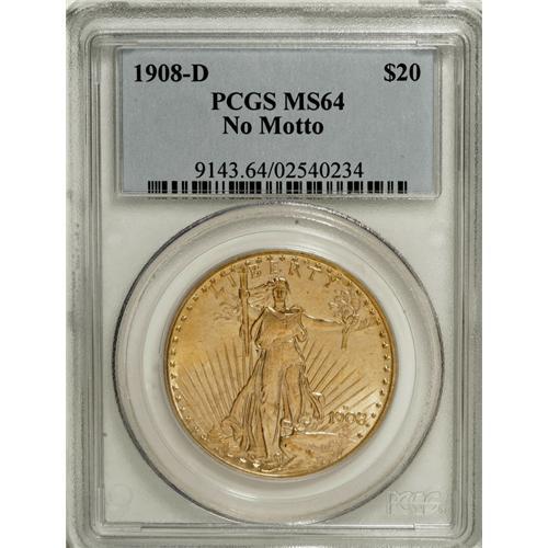 <B>1908-D $20 No Motto MS64 PCGS.</B></I> This is a gorgeous double eagle with frosty and highly lustrous surfaces that are exceptional for the assigned grade. Although not scarce in Choice Mint State quality, this date is difficult to locate in Gem grades with only 167 better ones certified by PCGS.<BR><BR><b>Shipping:</b> Coins & Currency (<a target="_blank" href="http://www.heritageauctions.com/common/shipping.php">view shipping information</a>)