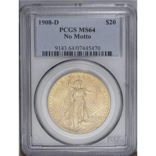 <B>1908-D $20 No Motto MS64 PCGS.</B></I> Typical for the grade with soft, glowing luster and lightly marked surfaces. Because this issue is often well-marked, examples are scarce and high priced at the Gem level, making attractive near-Gem specimens such as the present example especially desirable.