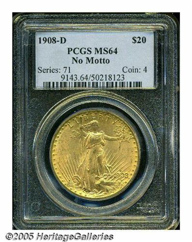 <B>1908-D<$20> No Motto MS64 PCGS.</B></I> Typically struck with satiny luster, lovely lime-green and red-gold coloration, and a few trivial surface blemishes that prevent the Gem assessment.