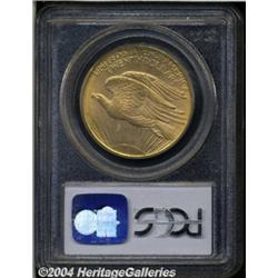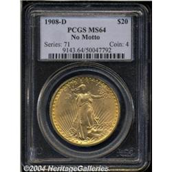 <B>1908-D<$20> No Motto MS64 PCGS.</B></I> Exceptional for the date with rose colored surfaces and fewer marks than are usually seen on a near-Gem of this date. Becomes scarce at the Gem level. <BR><BR><B>Important notice:</B> Heritage usually auctions material at the rate of 200-250 lots per hour. On some occasions eBay Live bid software or the Internet may not be able to keep up with the pace of the auction. We recommend placing a realistic absentee bid now as insurance to avoid disappointment. Occasionally the auctioneer may eliminate or reject an eBay Live bid, and the auctioneer may also reopen a lot after the close of the eBay live bidding (usually because we missed an audience bid), and may reject your bid even if it shows you as the winning bidder. By bidding via eBay Live, you agree that Heritage may award the lot to another bidder at its sole discretion under the circumstances described above or any other reasonable circumstances. Since eBay bids are not shown to us until we open the lot on the floor, we treat those bids just like floor bids. In most cases the floor responds before the eBay bid is presented to us, due to Internet lag time, so for consistency we have made it a policy that floor bids are always considered first over tie eBay live bids. Also please note that all Heritage lots purchased through eBay Live carry a 20% Buyer's Premium. Please make sure you read the Terms and Conditions before you bid. </span></font></tr></table></td></tr></table>