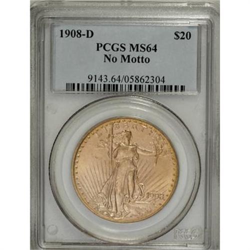 <B>1908-D $20 No Motto MS64 PCGS.</B></I> Long Rays Obverse. This satiny near-Gem is crisply struck, since the eagle's breast and legs have no indication of weakness. The reverse is surprisingly unabraded, while the obverse is smooth aside from minor contact to the lower left of the torch.<BR><BR><B>Coin Engraver:</B> Augustus Saint-Gaudens<BR><BR><b>Shipping:</b> Coins & Currency (<a target="_blank" href="http://www.heritageauctions.com/common/shipping.php">view shipping information</a>)