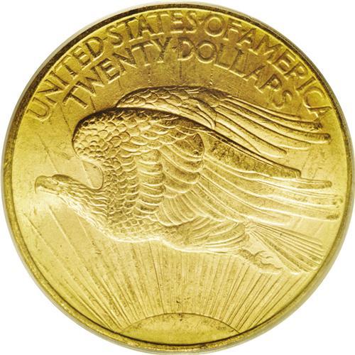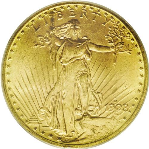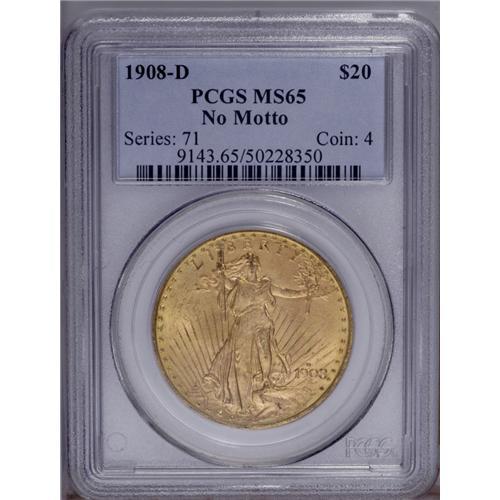 <B>1908-D<$20> No Motto MS65 PCGS.</B></I> Long rays. Satin luster sweeps across this original olive-gold Gem. Sharply struck for the No Motto type, particularly on the eagle's leg and the Capitol building. A couple of moderate marks are found directly above the mintmark, which is nicely repunched within the loop. Unlike its Philadelphia counterpart, the 1908-D No Motto is hard to find in high Mint State grades.