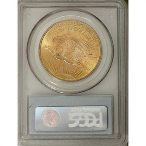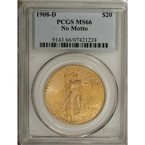 <B>1908-D $20 No Motto MS66 PCGS.</B></I> Long Rays. Orders were issued on February 4 to ship double eagle dies and edge collars to the Denver Mint. Along with the package came a message from engraver Charles Barber warning that the new coins would " ... not pile to standard height ..." This was a potentially serious problem because banks and counting houses (even the mint's own adjustors and coin counters) made trial balances using coins piled to the same height. If a stack were too short, a coin was added on the assumption that twenty pieces always made the same height stack. Twenty of the old Liberty Head twenty dollar gold pieces made a pile 1.937 inches high, but the new coins amounted only to 1.852 inches for twenty pieces--a difference of almost one full coin in height. By making new hubs, changing the width of the rim, and making the dies more convex, the mint was able to make the coins thicker and had solved this problem by the end of March.<BR> The first Denver Mint coins also apparently shared the excess diameter problem with Philadelphia, but corrections were made, and coins issued after about March 1, 1908, should have been of the correct 1.350 inches in diameter and extra thickness. As with the Philadelphia issue, varieties with short and long obverse rays are known and seem to be of about equal availability. (Short Rays--ray immediately above the 8 ends just before the star; Long Rays--ray immediately above the 8 ends past the star.) Differences in ray length might be associated with the new hub made to correct thickness and diameter problems. It is possible the Short Ray varieties are also thinner and slightly wider than their Long Ray counterparts, but to date no studies have been conducted in this area. Revised No Motto dies were distributed in March 1908, followed in late May by new dies including the motto mandated by Congress.<BR> This is a splendidly preserved example that is attentively struck throughout. The bright, frosted surfaces show no obvious abrasions and each side displays rich reddish-golden color with a significant accent of lilac over the highpoints. Population: 9 in 66, 0 finer (11/07).<BR><I>From The Jacob Collection of Saint-Gaudens Double Eagles.</B></I><BR><BR><B>Coin Engraver:</B> Augustus Saint-Gaudens<BR><BR><b>Shipping:</b> Coins & Currency (<a target="_blank" href="http://www.heritageauctions.com/common/shipping.php">view shipping information</a>)