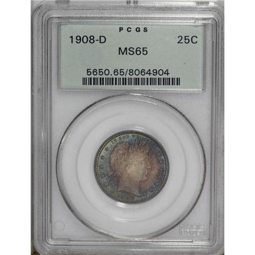 <B>1908-D 25C MS65 PCGS.</B></I> Sunset-orange, blue-green, and gold toning decorates this highly appealing Gem. Solidly struck with strong luster. Population: 18 in 65, 7 finer (10/06).<BR><BR><b>Shipping:</b> Coin/Currency (<a target="_blank" href="http://www.heritageauctions.com/common/shipping.php">view shipping information</a>)
