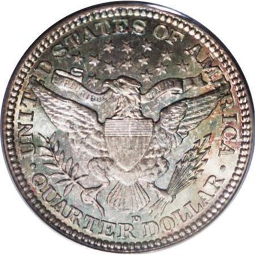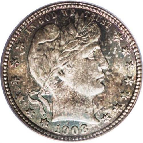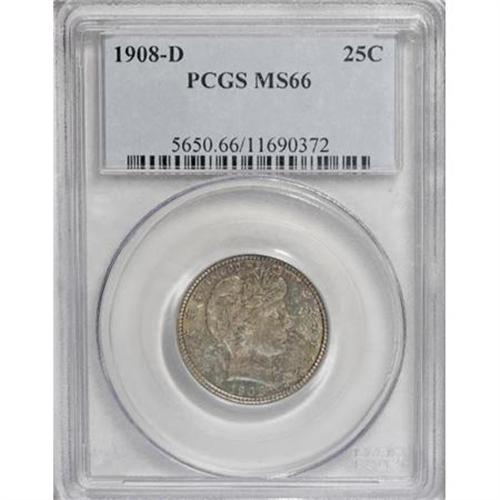 <B>1908-D 25C MS66 PCGS.</B></I> Aquamarine and rose-gold toning consumes this lustrous and magnificently smooth Premium Gem. This exceptional Barber quarter merits a place of honor within the finest quality collection. Light recutting is present within the lower loop of the 9 in the date. Population: 9 in 66, 0 finer (6/07).<BR><I>From The Belle Glade Collection, Part Two.</B></I><BR><BR><B>Coin Engraver:</B> Charles E. Barber<BR><BR><b>Shipping:</b> Coins & Currency (<a target="_blank" href="http://www.heritageauctions.com/common/shipping.php">view shipping information</a>\)