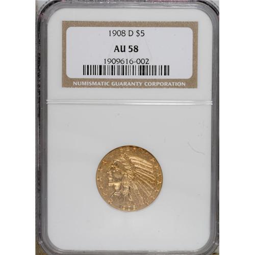 1908-D $5 AU58 NGC. NGC Census: (60/1823). PCGS Po