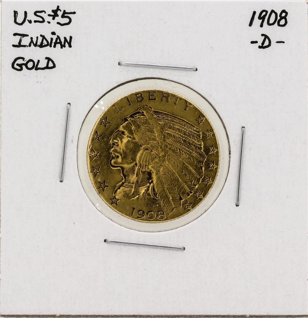 One 1908-D $5 Indian Head Half Eagle Gold Coin .