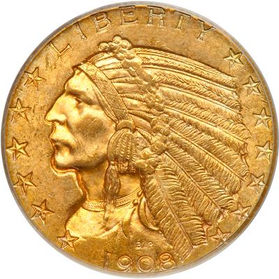 1908-D $5 Indian. PCGS graded MS-63. Old green holder. Lovely orange and gold toning. Well struck. A nice dusting of golden luster covers the surface of this First Year issue. The Indian type was the handiwork of several artists and mint engravers. Bela Lyon Pratt was the coin's designer. A pupil of the famous Augustus Saint-Gaudens, Pratt based his "standing eagle" motif on the reverse of his mentor's gold ten-dollar coin of 1907 (PCGS # 8511).