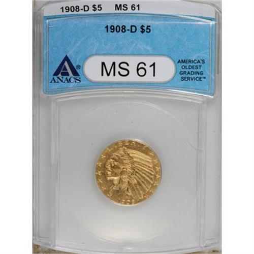 1908-D $5 MS61 ANACS. NGC Census: (170/1657). PCGS