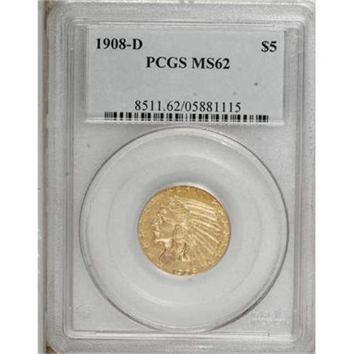 <B>1908-D $5 MS62 PCGS.</B></I> . PCGS Population (818/1408). NGC Census: (706/1023). Mintage: 148,000. Numismedia Wsl. Price for NGC/PCGS coin in MS62: $1,125. (#8511)<BR><BR><B>Coin Engraver:</B> Bela Lyon Pratt<BR><BR><b>Shipping:</b> Coins & Currency (<a target="_blank" href="http://www.heritageauctions.com/common/shipping.php">view shipping information</a>)
