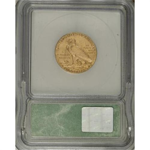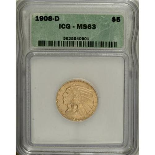 <B>1908-D $5 MS63 ICG.</B></I> A satiny half eagle with subtle olive and canary-gold toning. The mintmark is razor-sharp. Seen much less often than its 1909-D successor.<BR><BR><B>Coin Engraver:</B> Bela Lyon Pratt<BR><BR><b>Shipping:</b> Coins & Currency (<a target="_blank" href="http://www.heritageauctions.com/common/shipping.php">view shipping information</a>)