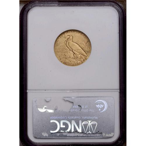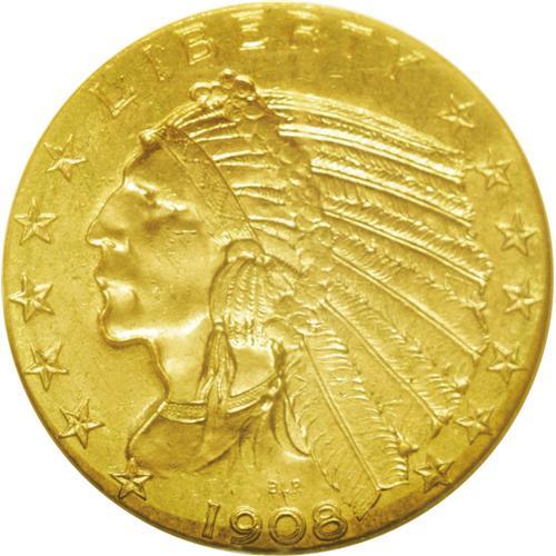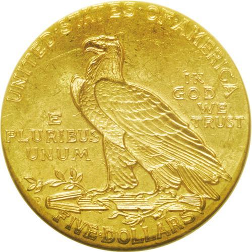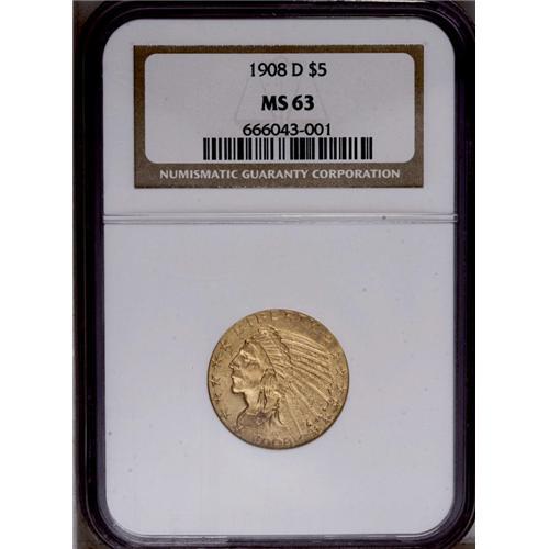 <B>1908-D<$5> MS63 NGC.</B></I> A satiny and reasonably struck example with even straw-gold coloration and a minimal number of marks for the assigned grade. The 1908-D trades as a type coin despite only 148,000 coins produced, the fourth lowest production of the series. Unlike Saint-Gaudens' eagle and double eagle designs, the first Bela Lyon Pratt quarter eagles and half eagles bore the motto IN GOD WE TRUST.