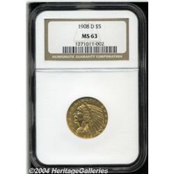 <table><tr><td><table><tr><td>1908-D $5 MS63 NGC. The surfaces display a lightly abraded, reddish-gold appearance with typical definition over the focal features. Both sides are, however, free of individually mentionable distractions.From the Fox Valley Coin Portfolio. <BR><BR><B>Important notice:</B> Heritage usually auctions material at the rate of 200-250 lots per hour. On some occasions eBay Live bid software or the Internet may not be able to keep up with the pace of the auction. We recommend placing a realistic absentee bid now as insurance to avoid disappointment. Occasionally the auctioneer may eliminate or reject an eBay Live bid, and the auctioneer may also reopen a lot after the close of the eBay live bidding (usually because we missed an audience bid), and may reject your bid even if it shows you as the winning bidder. By bidding via eBay Live, you agree that Heritage may award the lot to another bidder at its sole discretion under the circumstances described above or any other reasonable circumstances. Since eBay bids are not shown to us until we open the lot on the floor, we treat those bids just like floor bids. In most cases the floor responds before the eBay bid is presented to us, due to Internet lag time, so for consistency we have made it a policy that floor bids are always considered first over tie eBay live bids. Also please note that all Heritage lots purchased through eBay Live carry a 20% Buyer's Premium. Please make sure you read the Terms and Conditions before you bid. <BR><BR><B>IMPORTANT ANNOUNCEMENT ABOUT RESERVES:</B> Heritage now divulges all reserves on its web site 7 days before every auction. If you want to know whether the reserve on this lot has been met, and if not, what the reserve amount is, please visit this lot page on the HeritageCoin.com web site, or email: bid@HeritageGalleries.com </span></font></td></tr></table></td></tr></table>