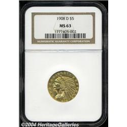 <B>1908-D<$5> MS63 NGC.</B></I> Otherwise green-gold in color, the lightly abraded surfaces reveal rose-gold tinting at more direct angles. Both sides are nicely detailed and free of individually bothersome abrasions. <BR><BR><B>Important notice:</B> Heritage usually auctions material at the rate of 200-250 lots per hour. On some occasions eBay Live bid software or the Internet may not be able to keep up with the pace of the auction. We recommend placing a realistic absentee bid now as insurance to avoid disappointment. Occasionally the auctioneer may eliminate or reject an eBay Live bid, and the auctioneer may also reopen a lot after the close of the eBay live bidding (usually because we missed an audience bid), and may reject your bid even if it shows you as the winning bidder. By bidding via eBay Live, you agree that Heritage may award the lot to another bidder at its sole discretion under the circumstances described above or any other reasonable circumstances. Since eBay bids are not shown to us until we open the lot on the floor, we treat those bids just like floor bids. In most cases the floor responds before the eBay bid is presented to us, due to Internet lag time, so for consistency we have made it a policy that floor bids are always considered first over tie eBay live bids. Also please note that all Heritage lots purchased through eBay Live carry a 20% Buyer's Premium. Please make sure you read the Terms and Conditions before you bid.