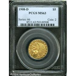 1908-D $5 MS63 PCGS. Well struck, with bright peac 1908-D $5 MS63 PCGS.